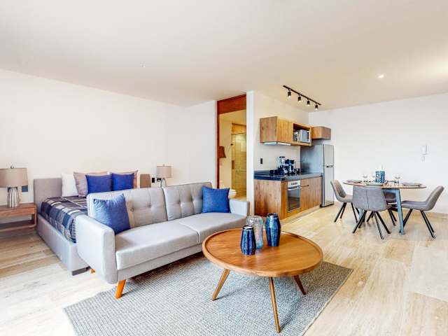 Die Unterkunft besteht aus einem Schlafzimmer, einem Wohnzimmer und einer voll ausgestatteten Küchenzeile, die mit einem Kühlschrank und einer Kaffeemaschine ausgestattet ist. Zudem gibt es ein Badezimmer mit Dusche und kostenlosen Pflegeprodukten. Handtücher und Bettwäsche werden bereitgestellt.
