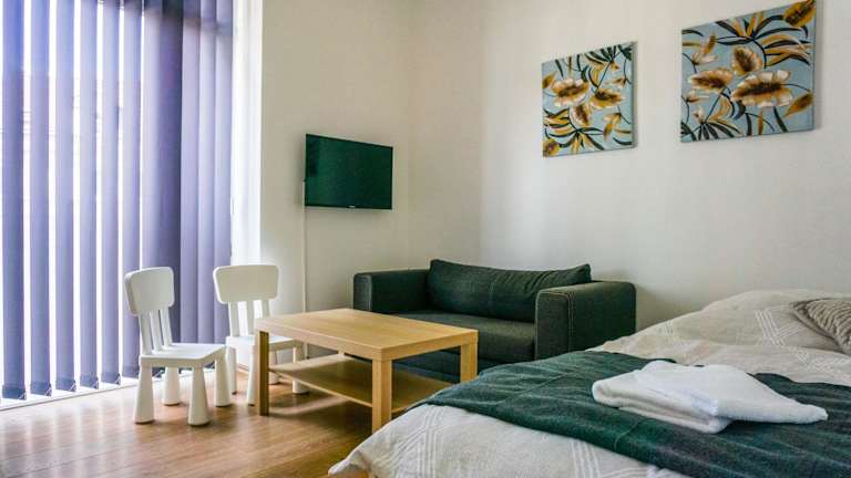Die Ferienwohnung besteht aus 2 Schlafzimmern, einem Wohnzimmer und einer voll ausgestatteten Küche, die mit einem Kühlschrank und einer Kaffeemaschine ausgestattet ist. Des Weiteren umfasst die Unterkunft ein Badezimmer mit Dusche und kostenlosen Pflegeprodukten. Handtücher und Bettwäsche werden bereitgestellt.