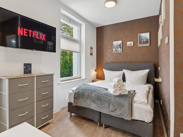 Die Ferienwohnung verfügt über 1 Schlafzimmer, einen Flachbild-TV mit Satellitenkanälen, eine gut ausgestattete Küche mit Kühlschrank und Mikrowelle sowie 1 Badezimmer mit Dusche. Handtücher und Bettwäsche werden bereitgestellt.