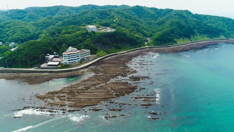 • Das Onsen hat eine atemberaubende Aussicht auf das Meer.
