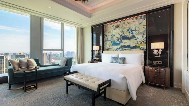 Das Waldorf Astoria Chengdu ist ein luxuriöses Hotel, das inmitten der Hi-Tech-Zone von Chengdu liegt und den Gästen erstklassige Unterkünfte und erstklassigen Service bietet. Die geräumigen und ruhigen Zimmer bieten einen atemberaubenden Stadtblick und sind mit modernen Annehmlichkeiten ausgestattet. Das Hotel verfügt über einen Innenpool auf der 48. Etage mit Blick auf Chengdu, ein 24-Stunden-Fitnesscenter und ein exklusives Spa. Es gibt auch eine Vielzahl von Restaurants und Lounges, darunter die Brasserie 99 und die Wall Street Bar auf der Dachterrasse.