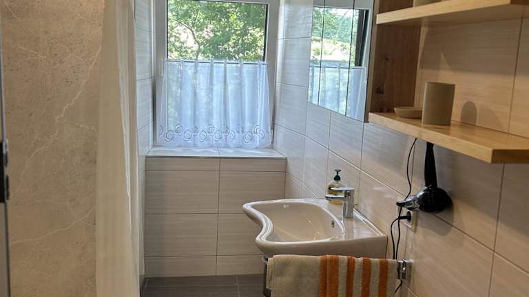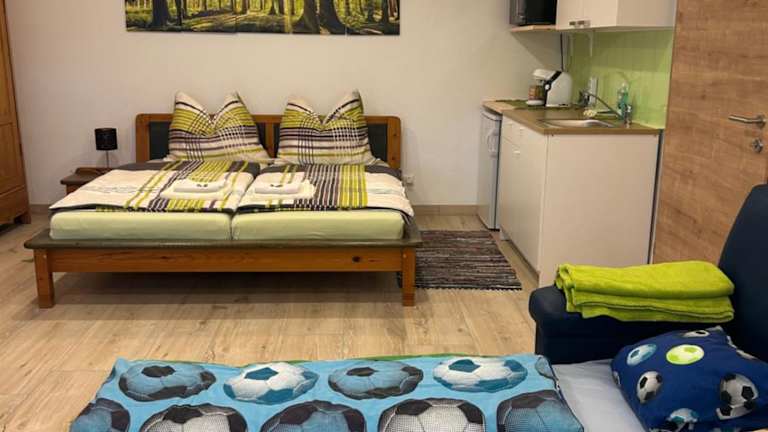 Die Ferienwohnung befindet sich im Erdgeschoss und bietet ein Schlafzimmer. Zur Ausstattung gehören ein Flachbild-TV mit Satellitenkanälen und eine voll ausgestattete Küchenzeile, die einen Kühlschrank, einen Ofen, eine Waschmaschine, eine Mikrowelle sowie eine Herdplatte umfasst. Handtücher und Bettwäsche werden bereitgestellt.