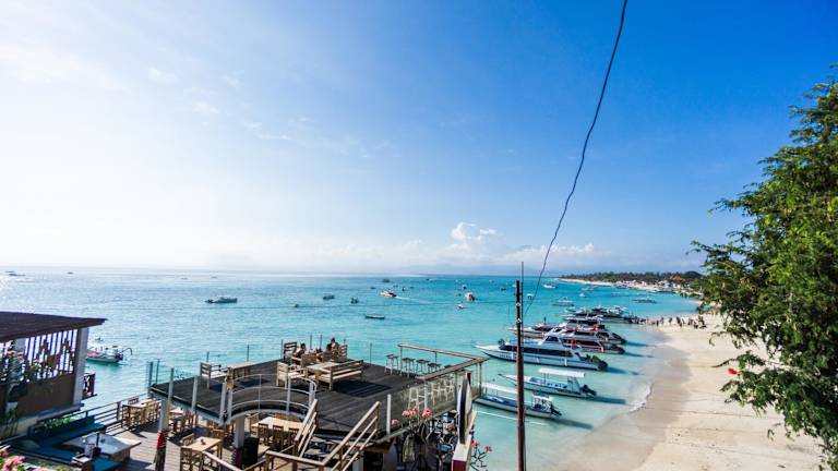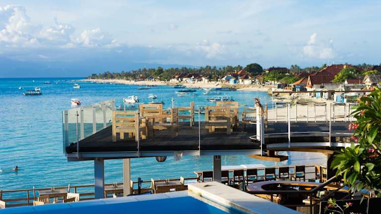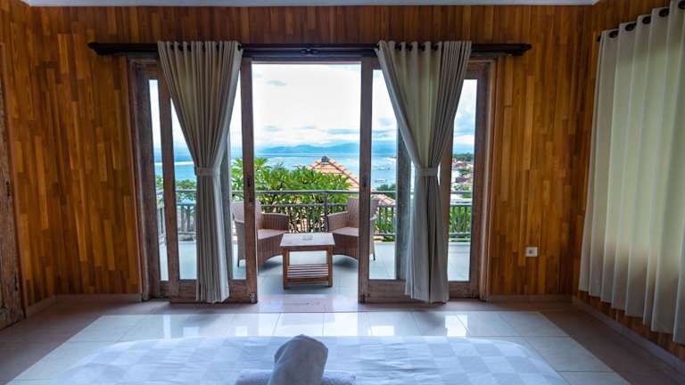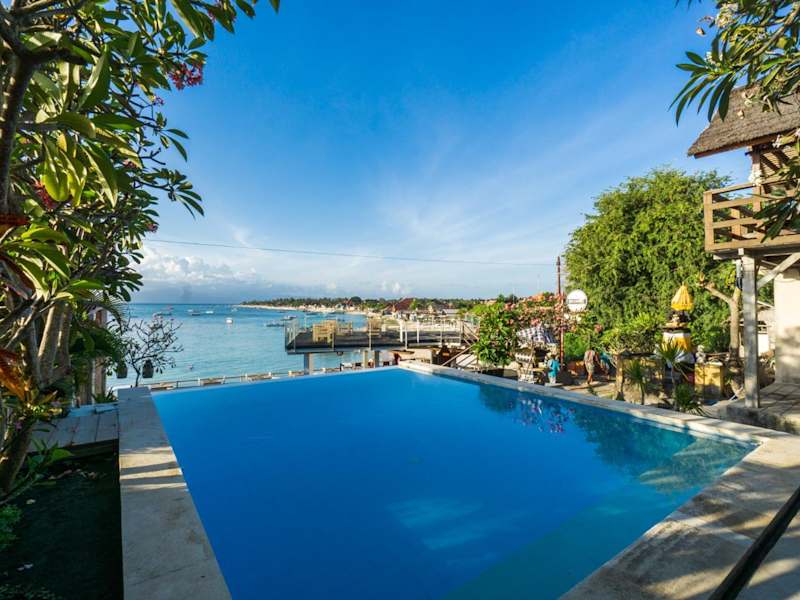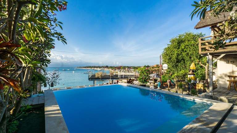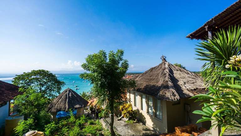Die Ware Ware Surf Bungalows befinden sich auf der Insel Lembongan, eine 30-minütige Fahrt mit dem Schnellboot vom Hafen Sanur entfernt. Eine herkömmliche Bootsfahrt zur Insel dauert etwa eine Stunde. Die Umgebung bietet eine klare Aussicht auf das Wasser der Bucht von Sanghiang.