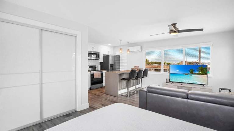 Die Ferienwohnung Waterfront Studio 1 bietet Übernachtungsmöglichkeiten mit einem Balkon und kostenlosem WLAN. Die Unterkunft verfügt über Klimaanlage und umfasst ein separates Schlafzimmer, ein Wohnzimmer sowie eine voll ausgestattete Küche.