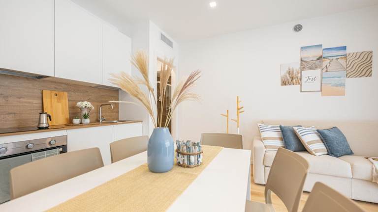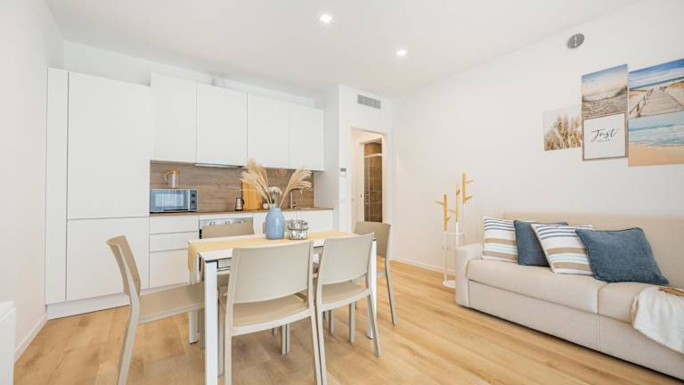 Die Ferienwohnung umfasst 2 Schlafzimmer, ein Wohnzimmer sowie eine voll ausgestattete Küche mit Kühlschrank. Ausgestattet ist sie zudem mit einem Badezimmer, welches ein Bidet und kostenlose Pflegeprodukte beinhaltet. Handtücher und Bettwäsche werden bereitgestellt.