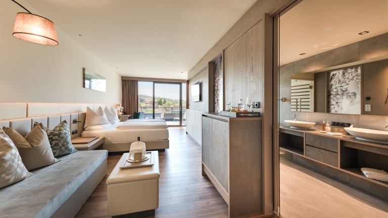Ob modern und zeitlos in unseren neuen private spaSUITEN oder charmant authentisch in unseren traditionellen Zimmern und Suiten – bei uns findet jeder seinen persönlichen Rückzugsort. Alle Zimmer sind mit folgender Ausstattung versehen: einem komfortablen Kingsize-Bett mit ergonomischen Boxspring-Matratzen, einer Wellness-Tasche mit Bademantel, Saunahandtuch und Slippern, Flachbild-TV, Tablet mit Entertainment-System, einer voll ausgestatteten Minibar, Kaffee-Tee-Maschine, Klimaanlage, Safe, edlen Kosmetik-Produkten, Föhn und Regenschirm.