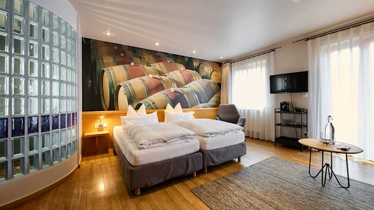 Unsere Doppelzimmer setzen neue Maßstäbe in Sachen Design und Komfort. Mit einem klaren, modernen Stil, der durch liebevolle Details abgerundet wird, bieten diese Zimmer eine Oase der Ruhe und des Wohlbefindens. Der großzügige, lichtdurchflutete Raum ist perfekt, um nach einem Tag voller Erlebnisse in der Südpfalz zur Ruhe zu kommen. Erwachen Sie in weichen Federbetten, umgeben von hochwertiger Leinenbettwäsche, und lassen Sie Ihren Blick über die sanften Hügel der umliegenden Weinberge schweifen. Diese Zimmer sind wie geschaffen für einen unvergesslichen Aufenthalt, bei dem jedes Detail stimmt – ideal für Paare, die das Besondere suchen. Alle Zimmer sind individuell eingerichtet und verfügen über einen Flachbild-TV und einen Balkon. Auch ein eigenes Bad mit einer Dusche und einem Haartrockner gehört zu den Annehmlichkeiten.