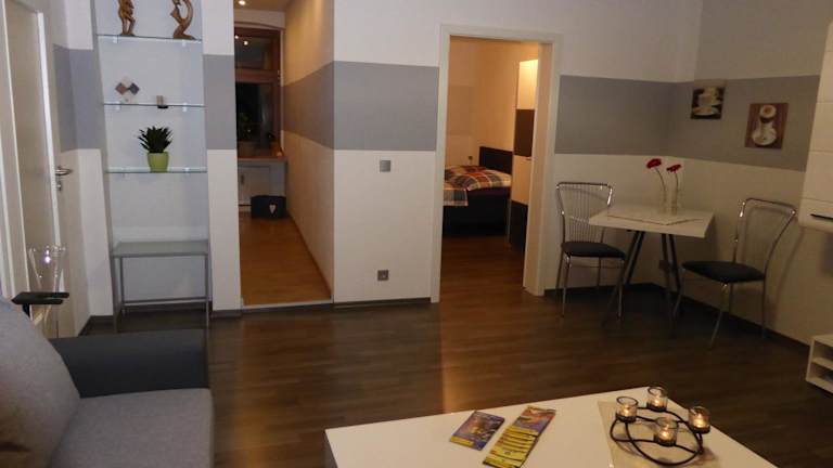 Die Ferienwohnung verfügt über ein Schlafzimmer, ein Wohnzimmer und eine voll ausgestattete Küche, die mit einem Kühlschrank und einer Kaffeemaschine ausgestattet ist. Darüber hinaus gibt es ein Badezimmer mit Dusche und Haartrockner. Handtücher und Bettwäsche werden ebenfalls bereitgestellt.