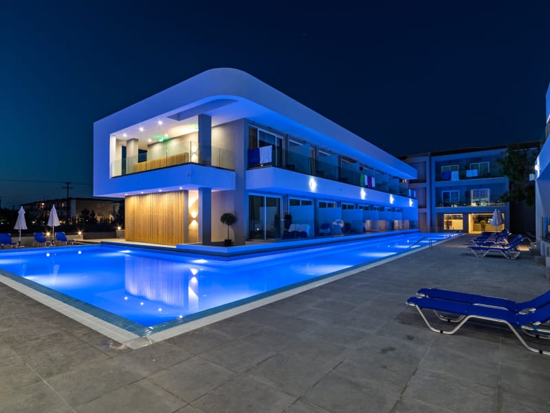 Das White Olive Premium Laganas ist ein 4-Sterne-Hotel in Laganas auf der griechischen Insel Zakynthos. Dieses ganz neue Hotel befindet sich in der Nähe des Zentrums eines der beliebtesten Urlaubsorte der Insel, Laganas. 500 m vom Hotel entfernt gibt es zahlreiche Souvenirläden und stimmungsvolle Tavernen und unzählige Bars, Clubs und Diskotheken. Das Hotel ist umgeben vom Nationalen Meerespark und Naturschutzgebiet 2000 und liegt nur 100 Meter von einem schönen, breiten Sandstrand mit sanftem Einstieg ins Meer entfernt. Das Hotel bietet seinen Gästen: drei Swimmingpools in verschiedenen Formen, zwei Becken für Kinder, zwei Bars, drei Terrassen, ein Restaurant und ein modernes Multisportfeld sowie einen Spielplatz.