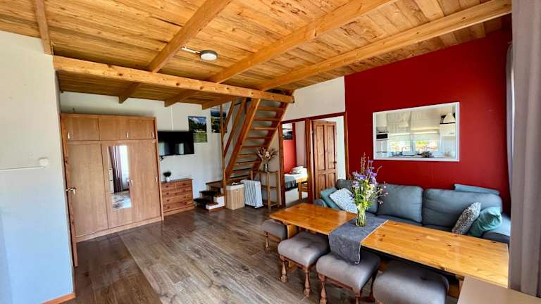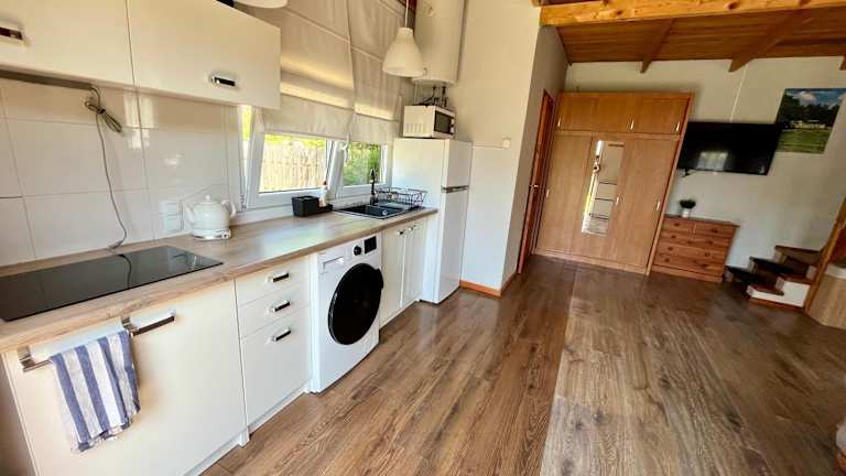 Das Ferienhaus liegt etwa 21 km vom Urwald Augustów entfernt und bietet somit eine perfekte Ausgangslage für Wanderungen und Radtouren. In der Umgebung gibt es viele Freizeitmöglichkeiten wie Angeln, Bootfahren und Kanufahren. Der Hancza-See ist nur 49 km entfernt und bietet eine wunderschöne Kulisse für Wassersportaktivitäten.