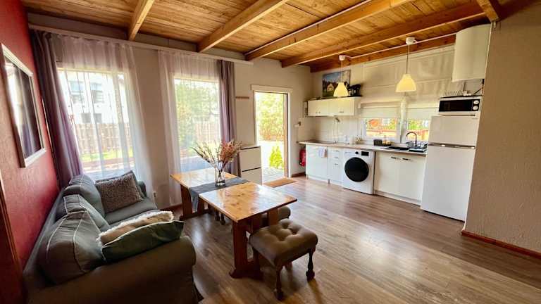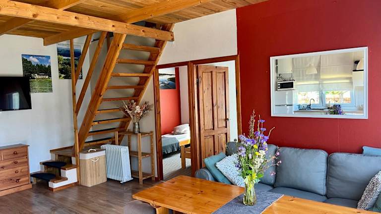 Das Ferienhaus verfügt über 3 gemütliche Schlafzimmer, ein geräumiges Wohnzimmer und eine voll ausgestattete Küche. Es gibt auch ein Badezimmer mit Dusche sowie eine Terrasse mit Seeblick. Das Haus bietet Platz für bis zu 6 Personen und ist somit ideal für Familien oder Freunde.
