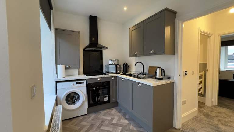 Die Ferienwohnung umfasst ein Schlafzimmer sowie ein Wohnzimmer, das mit einem Flachbild-TV ausgestattet ist. Des Weiteren gibt es eine voll ausgestattete Küche, die den Gästen die Möglichkeit bietet, eigene Mahlzeiten zuzubereiten.