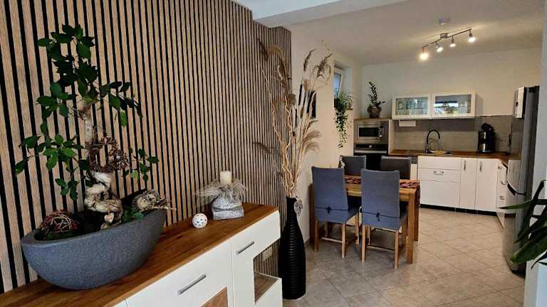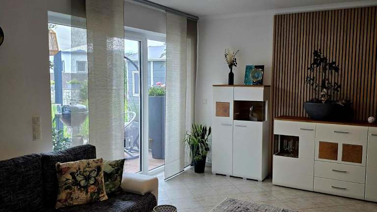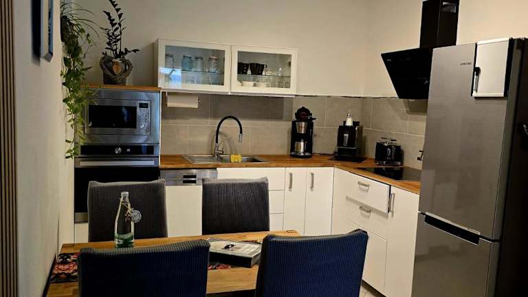 Die Ferienwohnung umfasst ein Schlafzimmer, ein Badezimmer mit Dusche, ein Wohnzimmer mit Essbereich sowie eine voll ausgestattete Küche. Zur Ausstattung gehören ein Kühlschrank, Geschirrspüler, Ofen, Flachbild-TV mit Satellitenkanälen, Blu-ray-Player, Spielekonsole (PS3), DVD-Player und CD-Player.