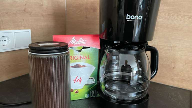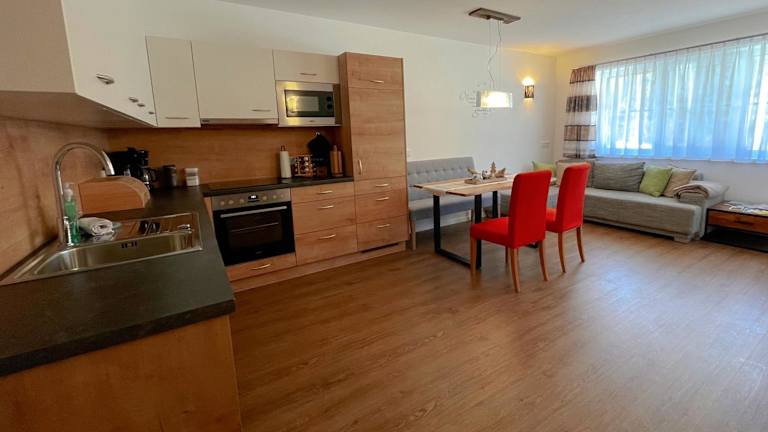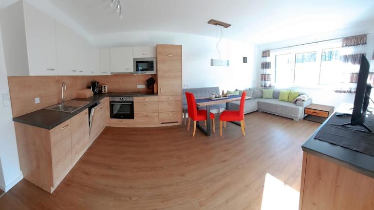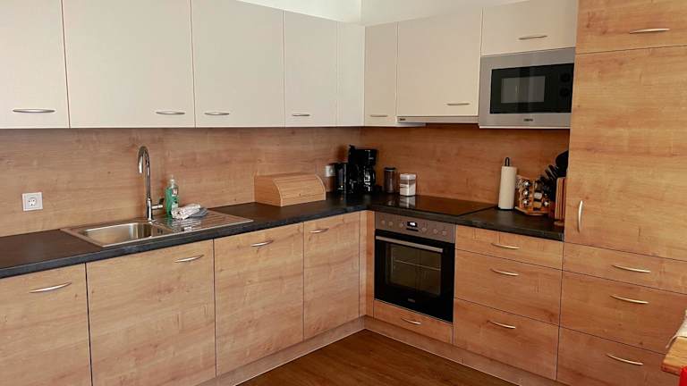 Die voll ausgestattete Küche in der Ferienwohnung umfasst einen Kühlschrank, Geschirrspüler, Ofen, Mikrowelle, Herdplatte, Kaffeemaschine und Wasserkocher. Zudem steht ein Grill zur Verfügung.