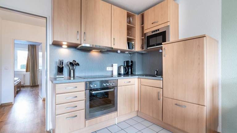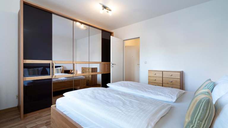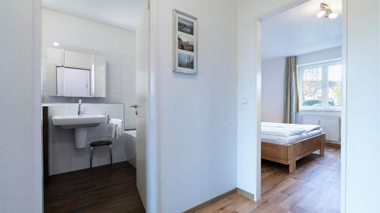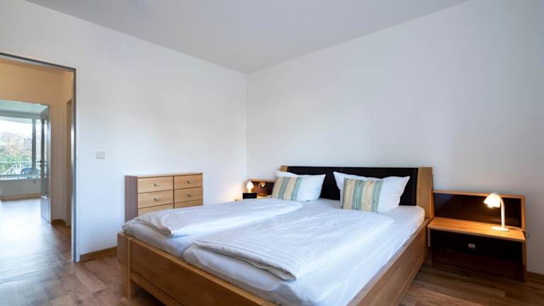 Das Appartement 27a umfasst zwei Schlafzimmer, ein Wohnzimmer sowie eine voll ausgestattete Küche mit Kühlschrank und Wasserkocher. Das Badezimmer ist mit einer Dusche und einer Badewanne ausgestattet. Handtücher und Bettwäsche werden bereitgestellt. Das Appartement hat zudem einen Balkon.