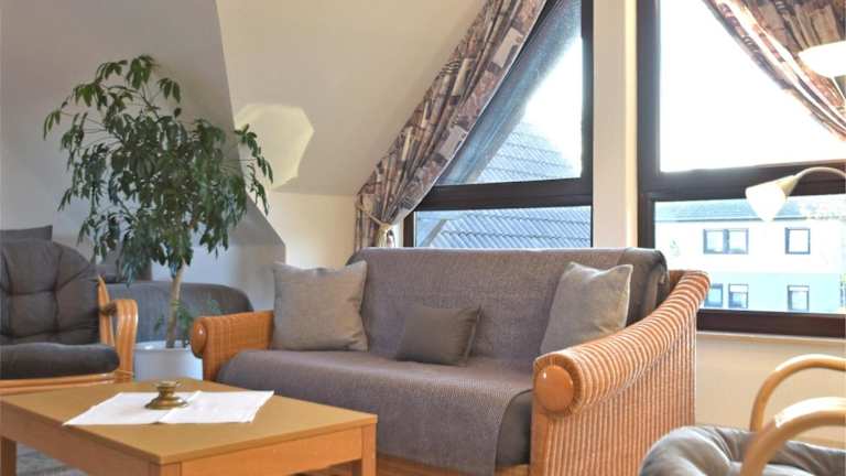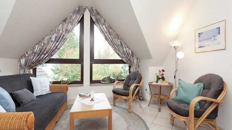 Die Ferienwohnung umfasst ein Wohnzimmer mit Sitz- und Essbereich, eine voll ausgestattete Küche (Kühlschrank, Geschirrspüler, Ofen), ein Schlafzimmer sowie ein Badezimmer mit Dusche und Badewanne. Handtücher und Bettwäsche werden zur Verfügung gestellt.