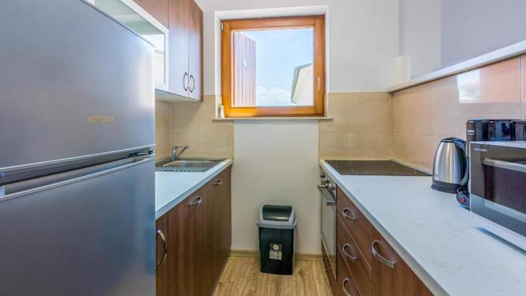 Die Unterkunft verfügt über eine gut ausgestattete Küchenzeile, die mit einem Kühlschrank, Geschirrspüler und Ofen ausgestattet ist. Hier können Gäste ihre Mahlzeiten selbst zubereiten.