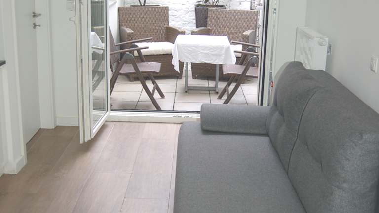 Die Wohnung verfügt über einen Schlafzimmer mit einem XL Kingsize Bett. Im Wohnraum mit Küche und Essbereich befindet sich eine Schlafcouch im Kingsize Format. Es gibt in der Wohnung ein Bad, eine abgetrennte Dusche und ein weiteres Bad mit WC. Vom Wohnraum gibt es eine große Türe, die zur Terrasse führt. Auf der Terrasse gibt es einen Tisch und Sitzmöglichkeiten.