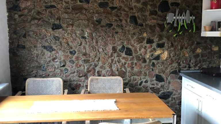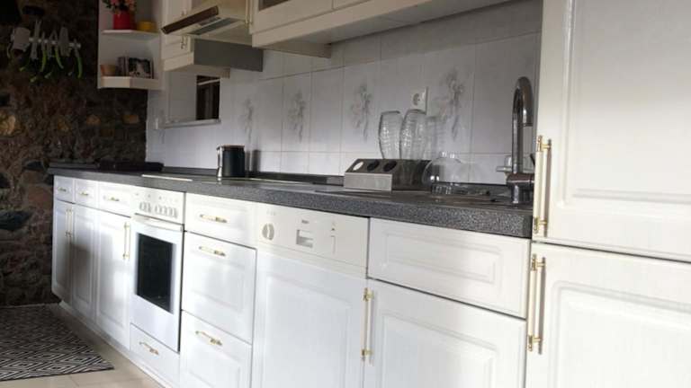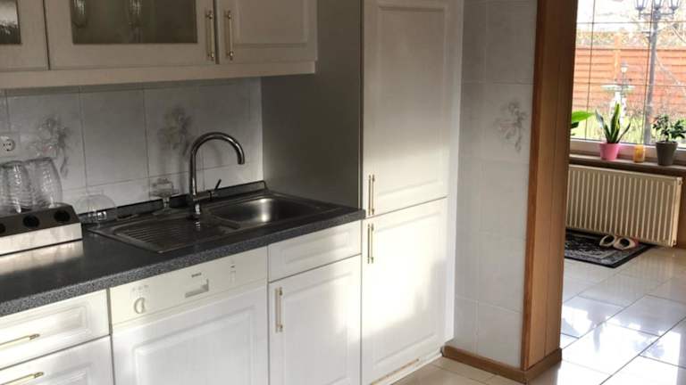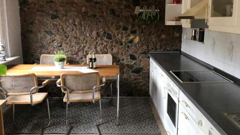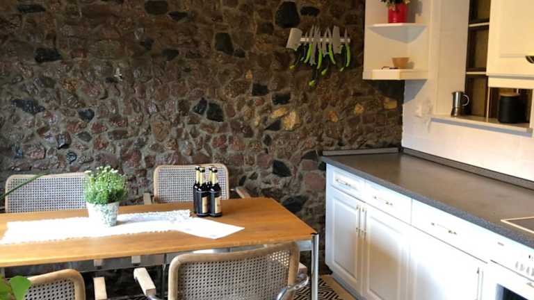 Die Ferienwohnung verfügt über eine gut ausgestattete Küche, die mit einem Kühlschrank, einem Geschirrspüler und einem Ofen ausgestattet ist. Zudem gibt es einen Essbereich im Wohnzimmer.