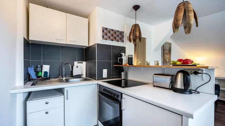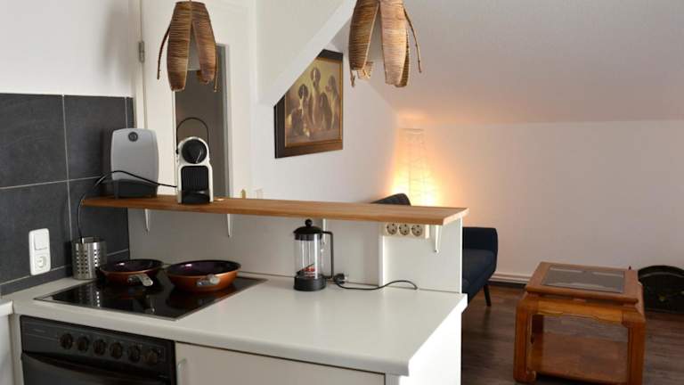 Die Ferienwohnung besteht aus einem Schlafzimmer, einem Wohnzimmer und einer voll ausgestatteten Küchenzeile, die mit einem Kühlschrank und einer Kaffeemaschine ausgestattet ist. Des Weiteren bietet die Wohnung ein Badezimmer mit Dusche und Haartrockner. Zur Unterhaltung steht ein Flachbild-TV mit Kabelkanälen zur Verfügung.