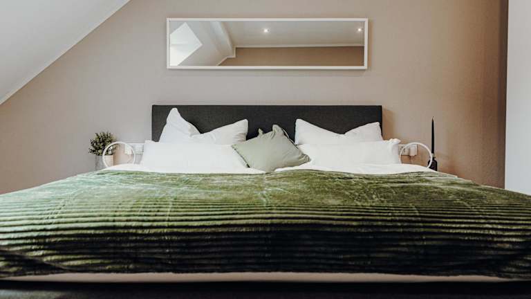 Die Ferienwohnung umfasst ein Wohnzimmer, einen Essbereich, eine Küche mit Kühlschrank, Geschirrspüler und Ofen sowie ein Schlafzimmer und ein Badezimmer mit Dusche. Handtücher und Bettwäsche werden bereitgestellt. Zudem befindet sich eine Spielekonsole in der Wohnung.