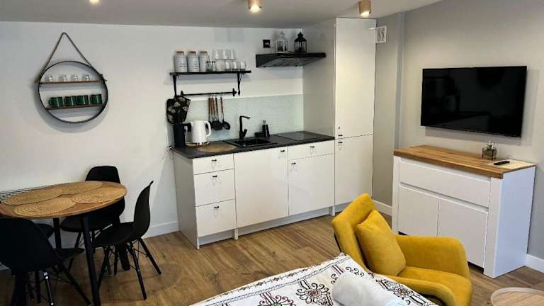 Die Unterkunft verfügt über Domki mit einem Balkon, einem Sitzbereich und einem Kabel Flachbild-TV. Jede Domki ist mit einer voll ausgestatteten Küchenzeile ausgestattet, die einen Kühlschrank und eine Herdplatte umfasst, sowie einem eigenen Badezimmer mit einer Dusche und einem Haartrockner.
