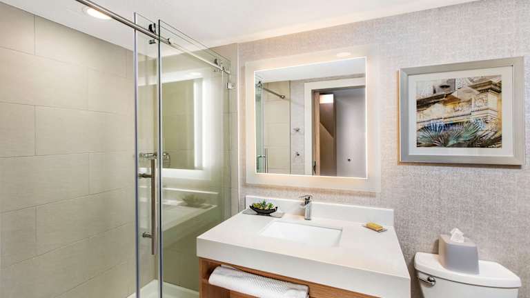Alle Zimmer im DoubleTree by Hilton San Antonio Northwest - La Cantera sind komfortabel eingerichtet und verfügen über Annehmlichkeiten wie einen 50-Zoll-Flachbildfernseher, eine Mikrowelle und einen Kühlschrank. Tee- und Kaffeezubehör sind ebenfalls vorhanden. Jedes Zimmer verfügt über einen beleuchteten Spiegel und einen Haartrockner.