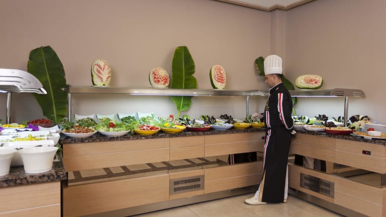 INNEN UND AUSSEN RESTAURANT & BAR (Speiseraum) : Kapazität für 400 Gästen, Essen in Büffetform. Servicezeiten von 08:00 – 21:00 Uhr STRAND A’LA CARTE RESTAURANT & BAR : Kapazität für 200 Gästen. Von der internationalen Küche A’la Carte serviert zwischen 10:00-18:00 Uhr und All-Inclusive Getränkeservice zwischen 10:00 – 23:00 Uhr. Öffnungszeiten Service von 10:00 – 02:00 Uhr. BIG HORN A’LA CARTE RESTAURANT & BAR : Kapazität für 100 Gästen. Internationale Küche A’la Carte und alle Lokal & Import Getränke werden serviert POOL BAR : für bis zu 50 Personen, zwischen 10:00 – 23:00 Uhr Getränke und Poolservice. X CAFE : für bis zu 50 Personen. Viele Kuchensorten, frisch gepresste Säfte und softdrinks werden serviert. Öffnungszeiten Service von 10:00 – 23:00 Uhr. TV SALON & LOBBY BAR : für bis zu 40 Personen. Plasma -TV und DVD-Home System, eigene Bar, Internetecke und Gästeinformation der Reiseveranstalter befindet sich im Info-Salon. All-Inclusive Getränkeservice zwischen 10:00 – 23:00 Uhr.
