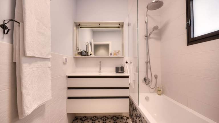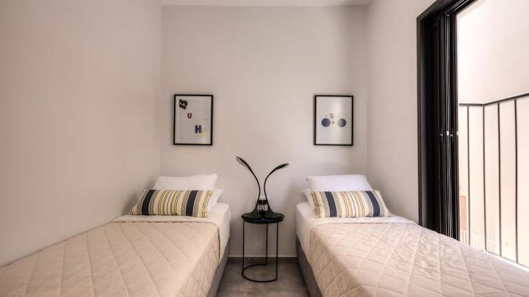 Die Ferienwohnung umfasst 2 Schlafzimmer, ein Wohnzimmer, eine voll ausgestattete Küche mit Kühlschrank und Kaffeemaschine sowie ein Badezimmer mit Dusche und Haartrockner. Handtücher und Bettwäsche werden bereitgestellt und die Klimaanlage sorgt für ein angenehmes Raumklima.