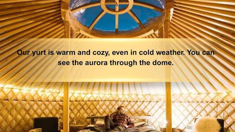 Die beheizten Jurten sind komfortabel eingerichtet und bieten Ihnen einen einzigartigen Aufenthalt. Jede Jurte verfügt über eine Dachkuppel, durch die Sie mit etwas Glück die faszinierenden Nordlichter bewundern können. WLAN nutzen Sie kostenfrei und können somit mit Ihren Liebsten in Kontakt bleiben.