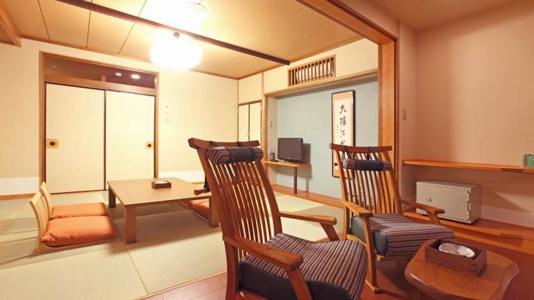Die klimatisierten Zimmer zeichnen sich durch einen Wohnbereich mit Tatami-Böden und einen eigenen Außenbereich mit Thermalbad aus. Die Zimmer sind mit Yukata-Roben und kostenlosem grünem Tee ausgestattet. Zusätzliche Einrichtungen wie ein Safe und Gepäckaufbewahrung sind ebenfalls vorhanden.