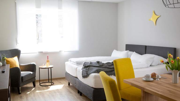 Jede Wohneinheit im ZeitRaum ist komfortabel und modern eingerichtet. Die Zimmer verfügen über eine voll ausgestattete Küchenzeile mit einem Esstisch, sodass Sie Ihre eigenen Mahlzeiten zubereiten können. Zur Ausstattung gehören auch ein Flachbild-Sat-TV und ein eigenes Badezimmer mit einer Dusche und einem Haartrockner. Ein Kühlschrank, ein Geschirrspüler, ein Backofen, eine Kaffeemaschine und ein Wasserkocher sind ebenfalls vorhanden, um Ihren Aufenthalt so angenehm wie möglich zu gestalten.