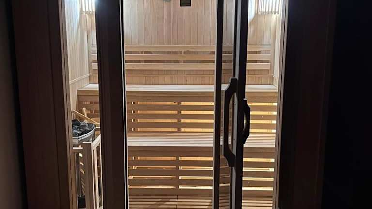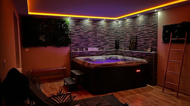 Der Wellnessbereich der Unterkunft beinhaltet eine Sauna und einen Whirlpool.