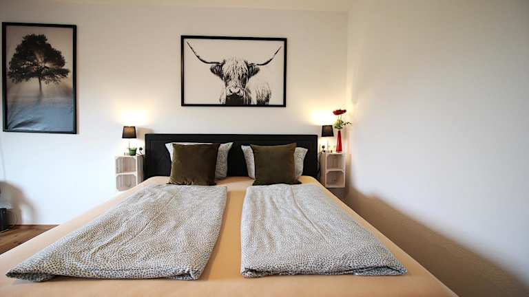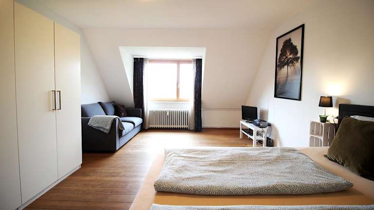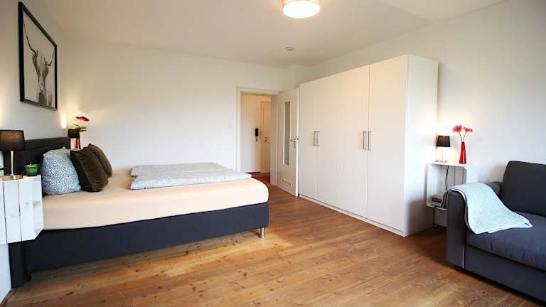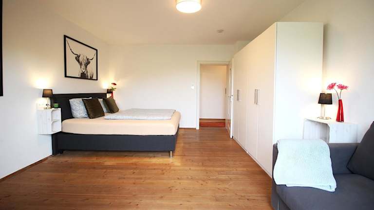 Die Ferienwohnung besteht aus einem Schlafzimmer, einer Küche und einem Badezimmer, ebenso ist ein Flachbild-TV vorhanden.