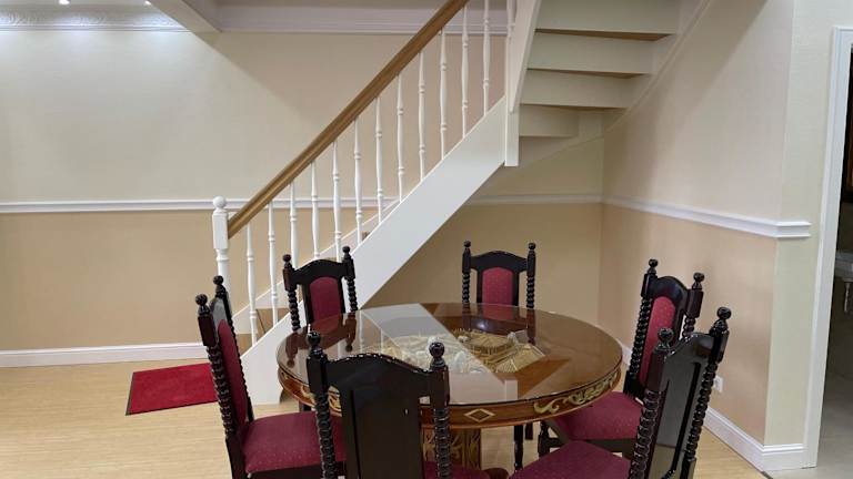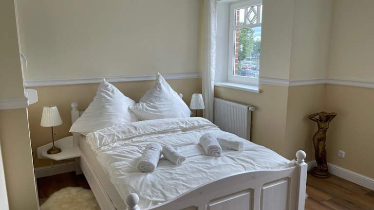 Das Ferienhaus im Zentrales Wohnen auf Zeit bietet Platz für bis zu 5 Personen und verfügt über 5 Schlafzimmer. Es gibt 1 Badezimmer mit Handtüchern und Bettwäsche. Der Wohnbereich ist mit einem Flachbild-Sat-TV ausgestattet und der Essbereich bietet ausreichend Platz für gemeinsame Mahlzeiten. Die voll ausgestattete Küche ermöglicht es Ihnen, Ihre eigenen Mahlzeiten zuzubereiten. Von der Terrasse aus haben Sie einen schönen Blick auf den Garten.