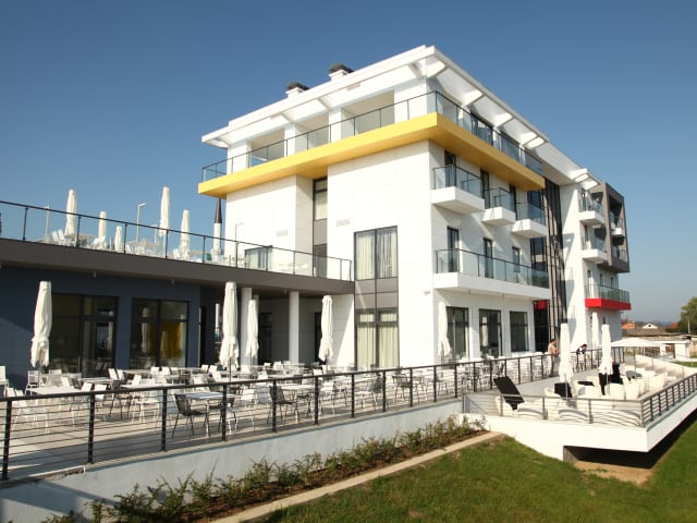 Ein sehr attraktives Hotel, das seinen Gästen eine luxuriöse Stimmung und den besten Service direkt am Ufer des wundervollen Flusses Una, direkt an der Grenze mit Republik Kroatien, bietet. Helle, gemütliche und breite Zimmer mit dem Blick auf den Fluss und die Stadt und alles, was Ihre Urlaubstage unschätzbar macht, sind der wahre Grund, warum viele Gäste in dieses Hotel zurückkehren. Das opulente Zepter Hotel des modernen Designs befindet sich im direkten Zentrum von Kozarska Dubica, am direkten Ufer des Flusses Una. Das Hotel bringt mit seinem Aussehen der Schönheit und dem Reichtum der Stadt bei und mit dem Inhalt und Service stellt es einen erstklassigen Dienstleistungskomplex dar, der bei der Kategorisierung mit 4 Sternen bewertet wurde. Dieses repräsentative Objekt ist nur eines der Geschenke von Philip Zepter an seine Heimatstadt, mit dem Wunsch, in die Gemeinde Kozarska Dubica zu investieren, wo er seine Kindheit verbracht hat. Die Architektur und die Innenraumlösung des Hotels hatte die Einzigartigkeit zum Ziel, aber auch die Erkennbarkeit nach allen bedeutenden Parametern für ein anderes Ambiente. Die Synthese der Differenzen ist sichtbar auch in anderen Segmenten, die Fusion von natürlicher Umgebung und renommiertem Design, dem Minimalismus und der Wärme, der Seriosität und der Verspieltheit. Der größere Teil der Fassade ist aus weißem Eternit und die surreale Weiße wird durch gelbe, rote und graue Segmente gebrochen, die vom Mondrian beeinflusst wurden und die zur selben Zeit das Wahrzeichen des Hotels geworden sind und erstrecken sich durch den ganzen Innenraum in Form von Details und Konturen.