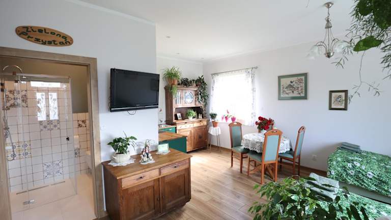 Das Apartment im Zielona Przystań verfügt über ein gemütliches Schlafzimmer, ein modernes Badezimmer und einen komfortablen Wohnbereich mit einem Flachbild-TV. Die voll ausgestattete Küchenzeile bietet alles, was man für die Zubereitung von Mahlzeiten benötigt. Die Terrasse mit Blick auf den Garten lädt zum Entspannen im Freien ein. Bettwäsche und Handtücher werden gestellt, um den Gästen einen angenehmen Aufenthalt zu ermöglichen.