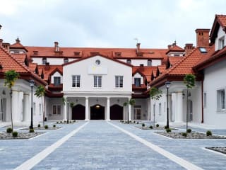 Zielony Kompleks Dwór Ostoya bietet Übernachtungsmöglichkeiten mit zahlreichen Annehmlichkeiten, darunter kostenlose Fahrräder und einen kostenlosen Privatparkplatz. Die Unterkunft verfügt über einen Garten und eine Gemeinschaftslounge. Zu den Dienstleistungen gehören Zimmerservice, ein Restaurant und eine Sonnenterrasse. Eine 24-Stunden-Rezeption sowie Flughafentransfers und kostenloses WLAN sind ebenfalls vorhanden.