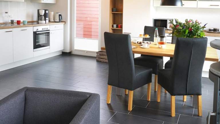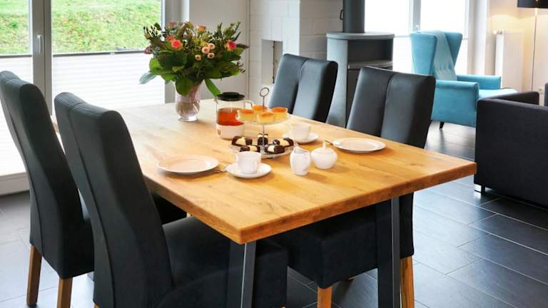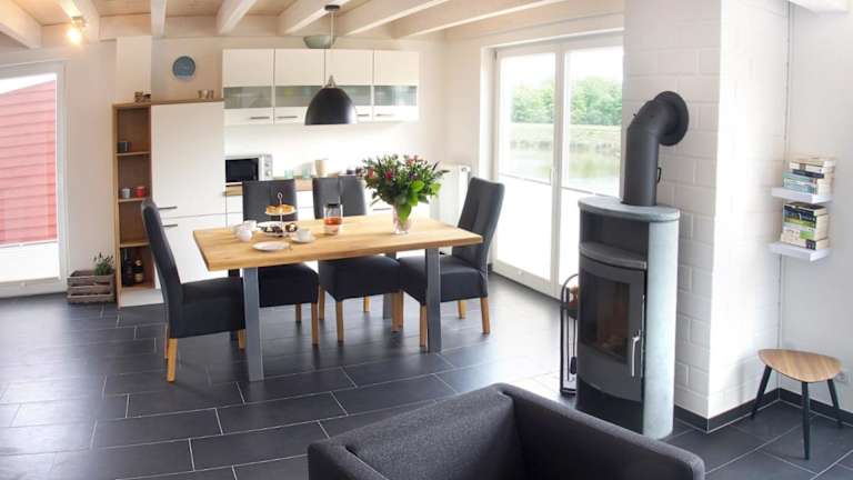 Das Ferienhaus beinhaltet zwei Schlafzimmer, ein Wohnzimmer mit Fernseher, eine voll ausgestattete Küche mit Kühlschrank und Geschirrspüler sowie ein Badezimmer mit Dusche.