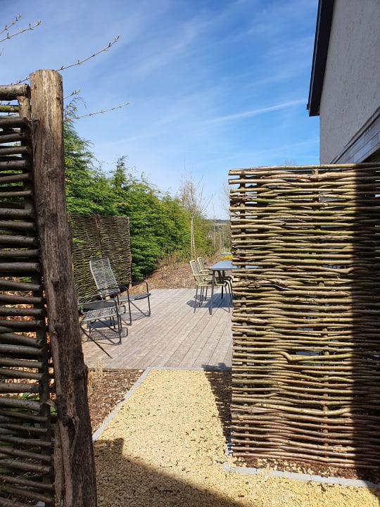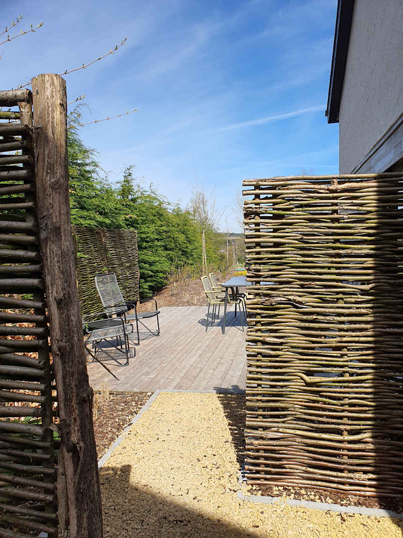 Blick hinterm Eingang auf die seitliche Sonnenterrasse. Dahinter befindet sich der Garten.