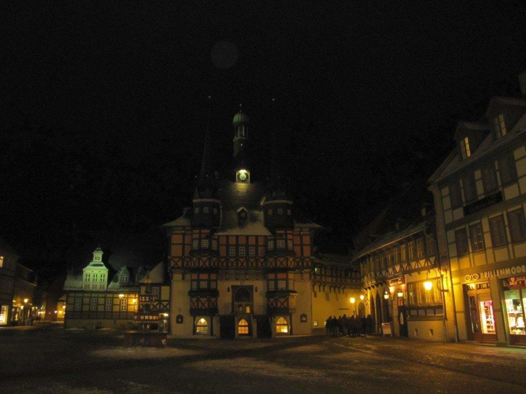 Abends vor dem Rathaus, links das Hotel