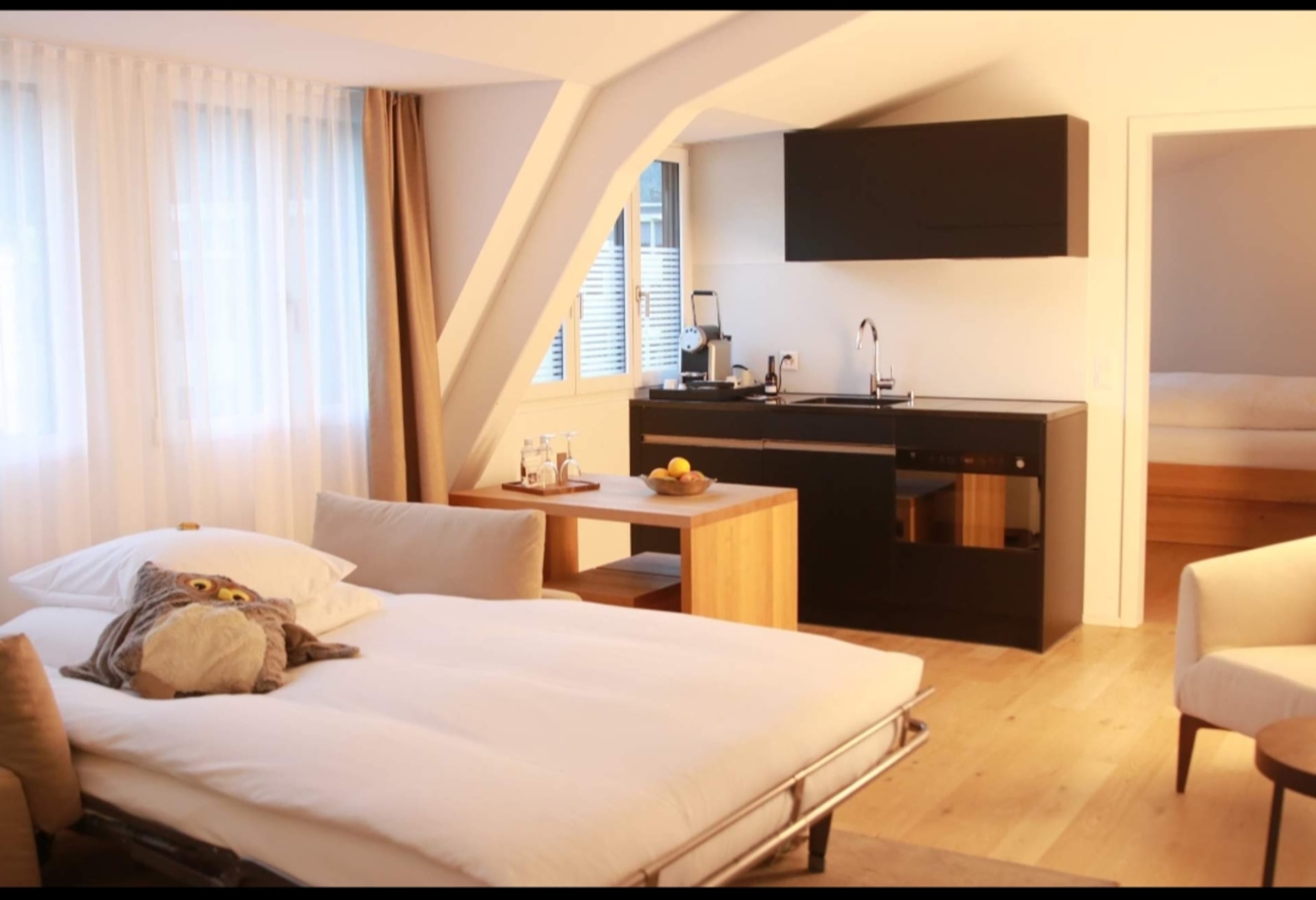 Suite 03, Hauptraum mit Bett fürs Kind und Küchenzeile
