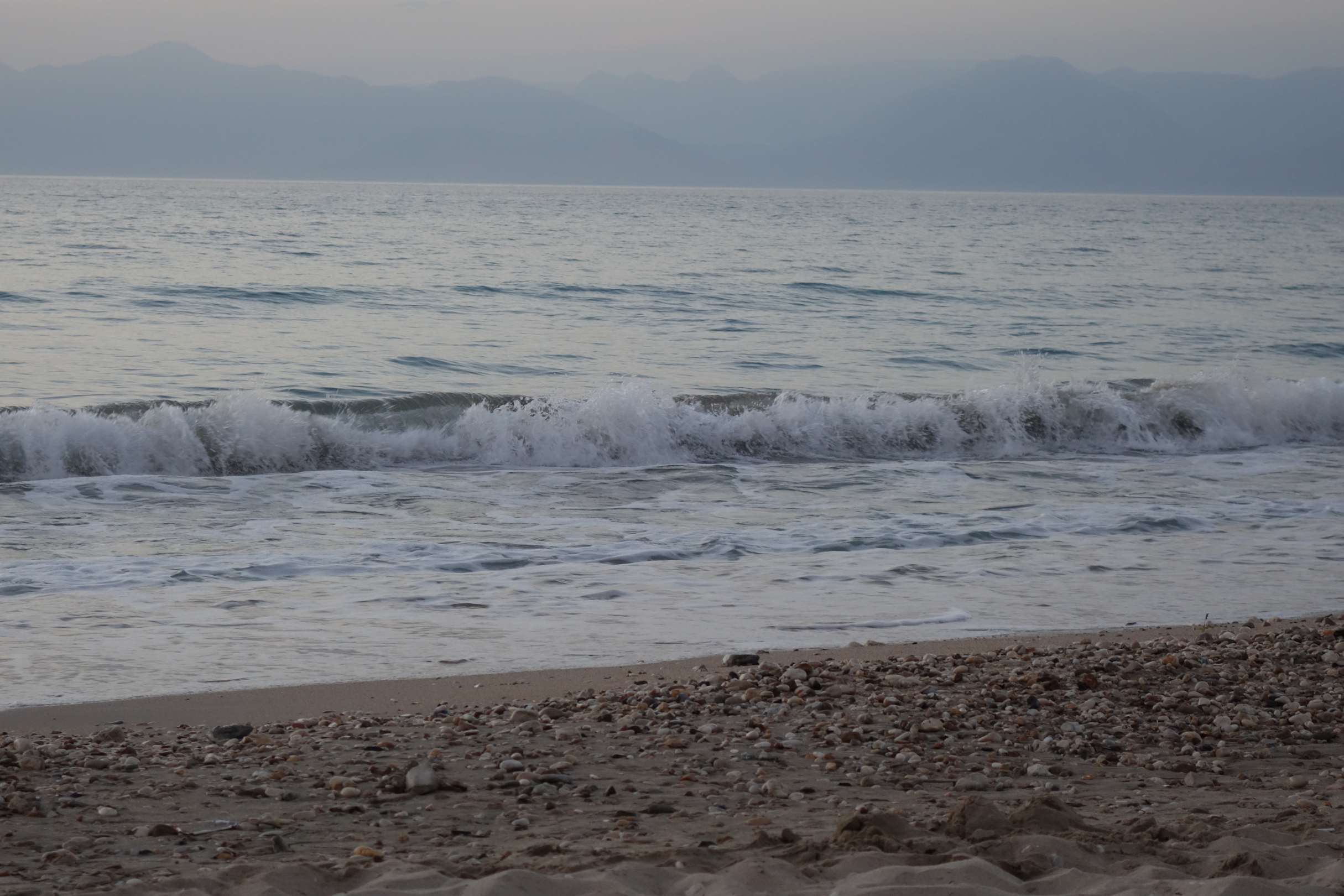 Strand manchmal von Kies durchzogen, Blick auf die albanische Küste