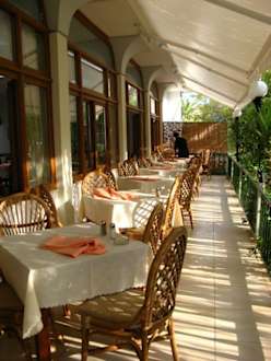 FrühstücksterrasseMorgens kann man in der Sonne draußen frühstücken, wenn man rechtzeitig im Restaurant ist.
