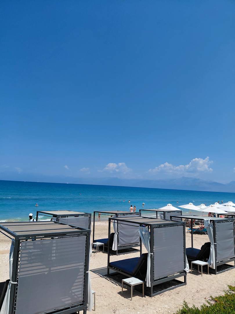 Aussicht von der Strandbar auf den Hotelstrand.