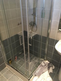Wasser läuft aus der Dusche, darum die Handtücher.