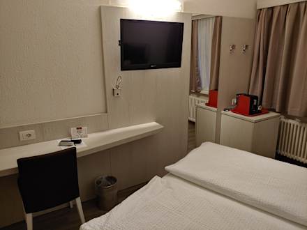 Schreibtisch, Fernseher und Espresso-Maschine