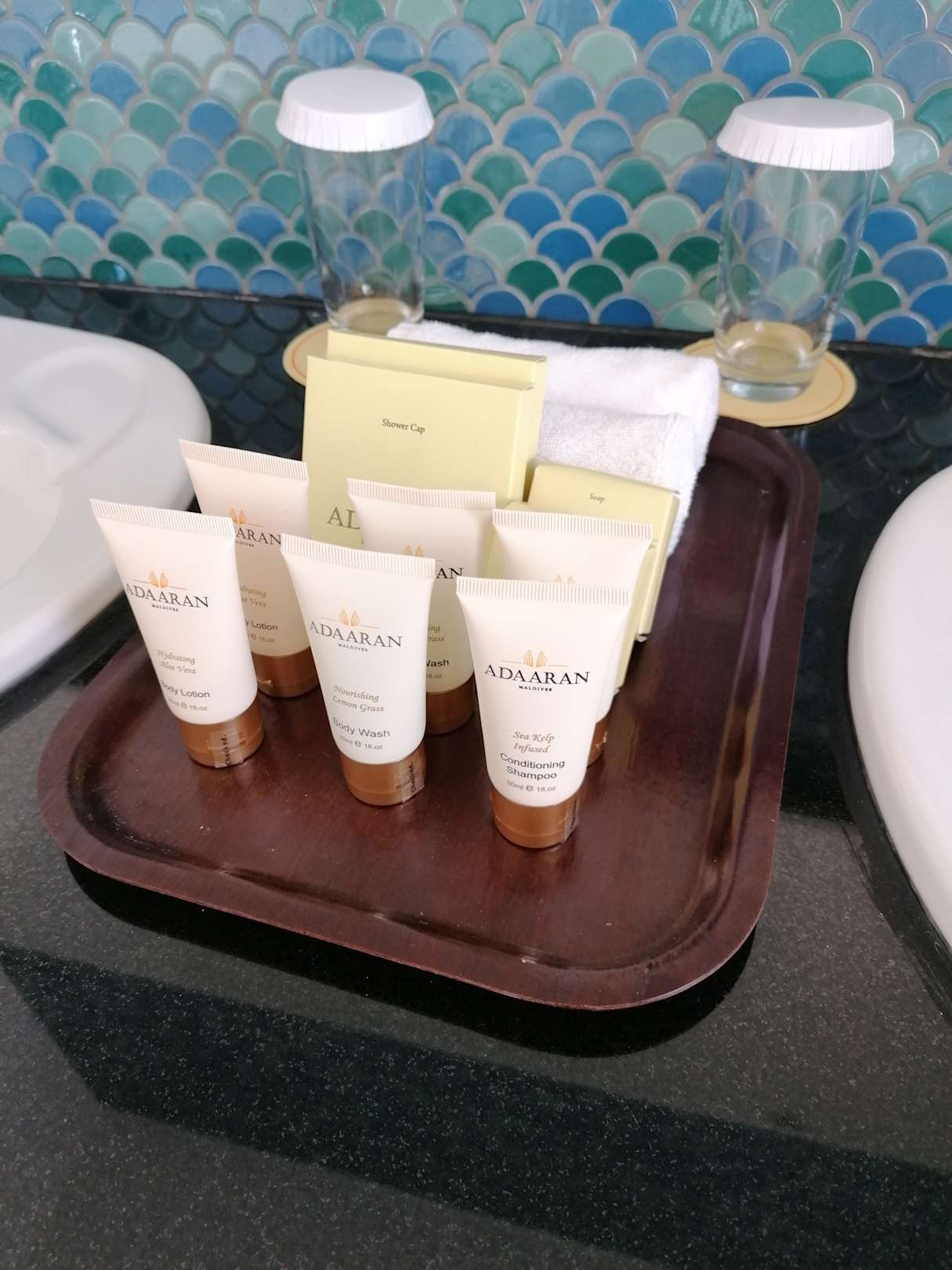 ZimmerBad. Es gab Kosmetiktücher, Seife, Duschhaube, Duschgel, Shampoo und Body Lotion. Leider keine Wattestäbchen und keine Wattepads.
