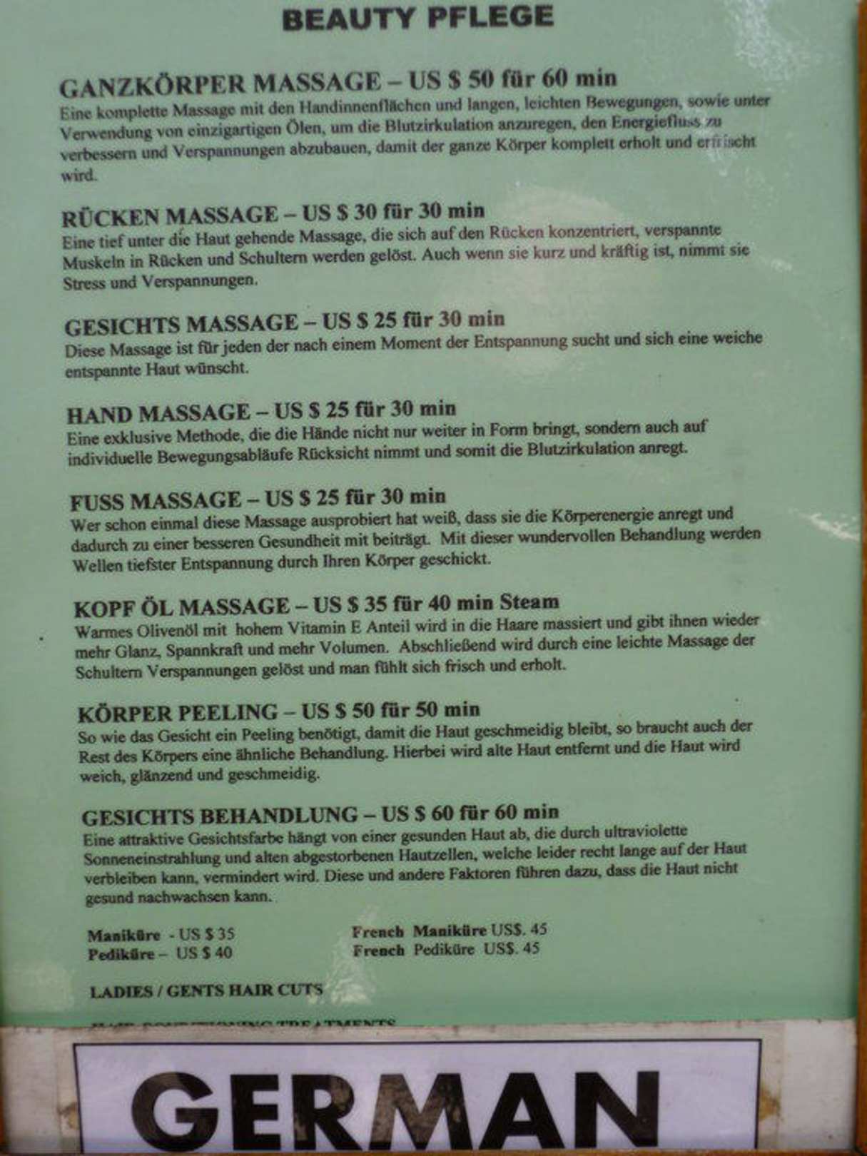 Preisliste, Beautysalon