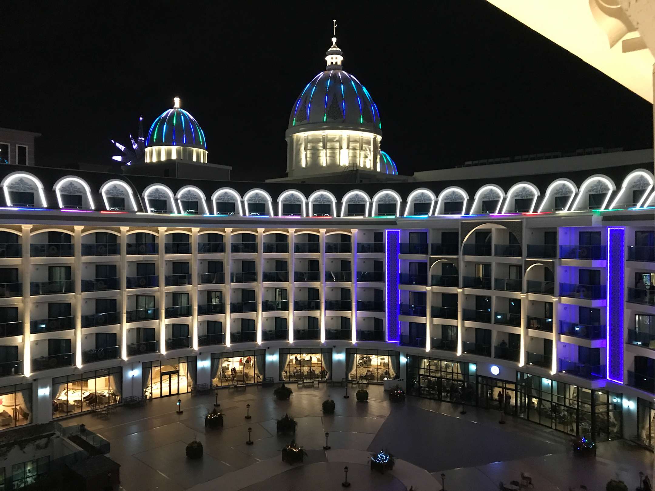 Das Hotel wird jeden Abend in bunten Farben beleuchtet.